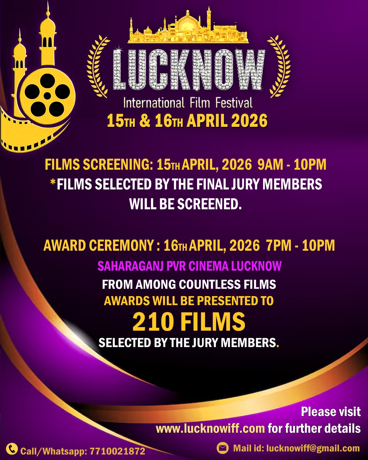 As announced on the official website, the Lucknow International Film Festival 2026 will host film screenings on 15th April 2026 from 9:00 AM to 10:00 PM and on 16th April 2026 from 9:00 AM to 6:00 PM. The Award Function will be held on 16th April 2026 from 7:00 PM to 10:00 PM. The screening list will be announced on 2nd April 2026, with a total of 210 films selected for the festival.
